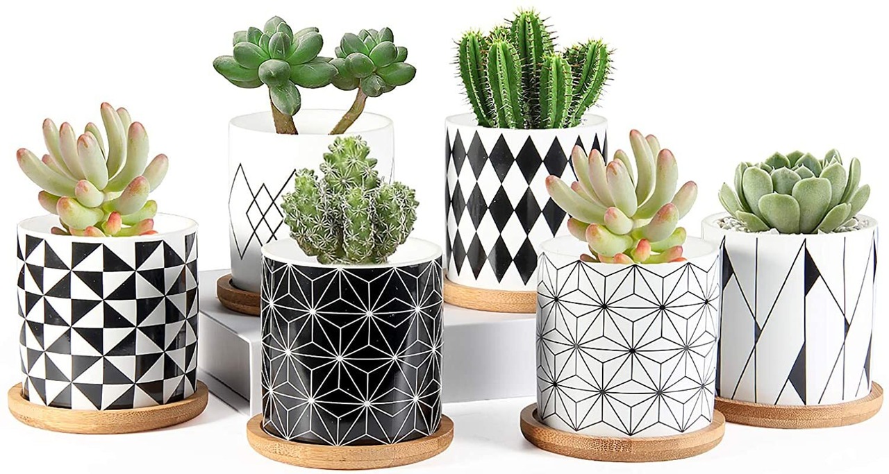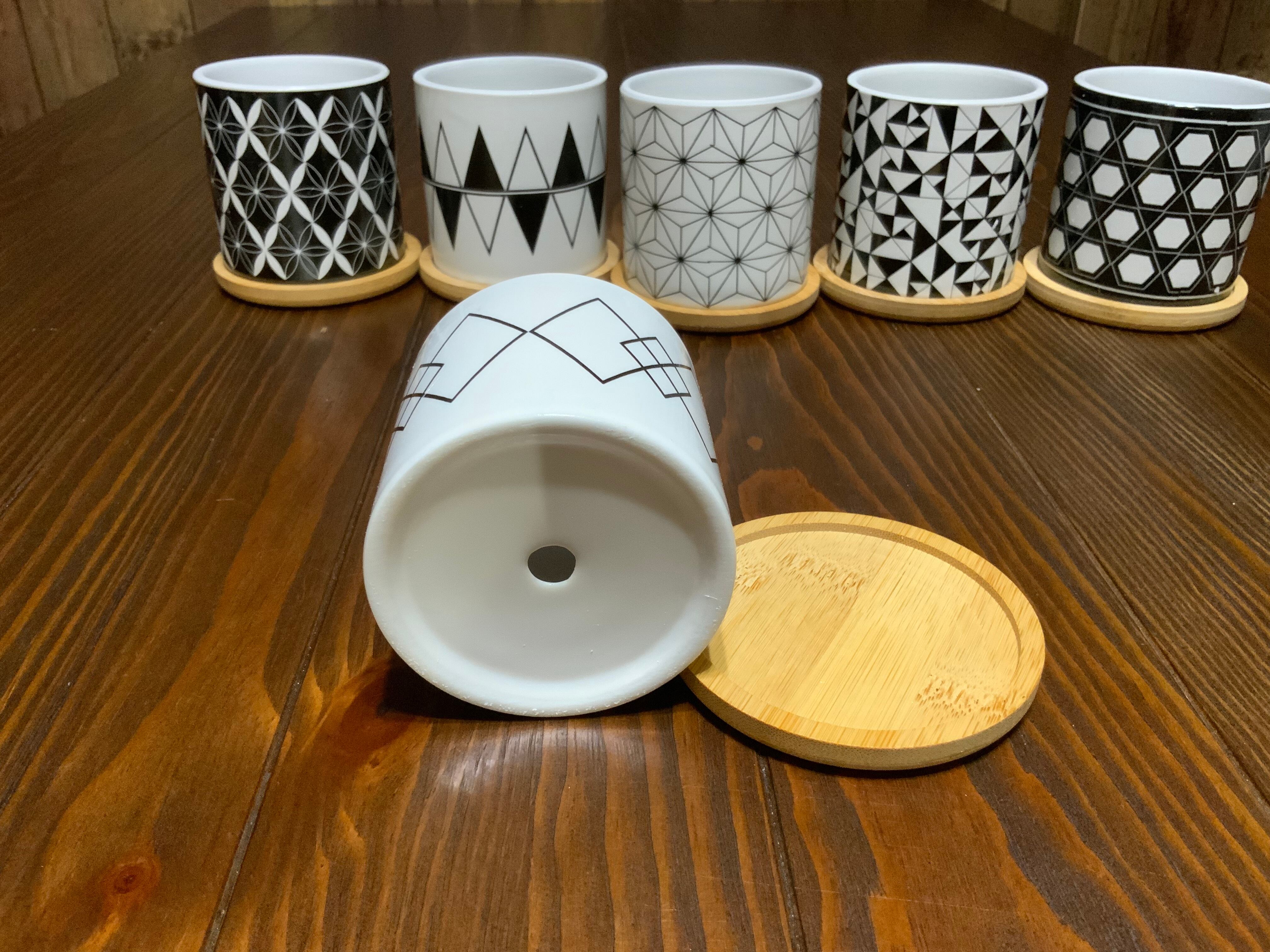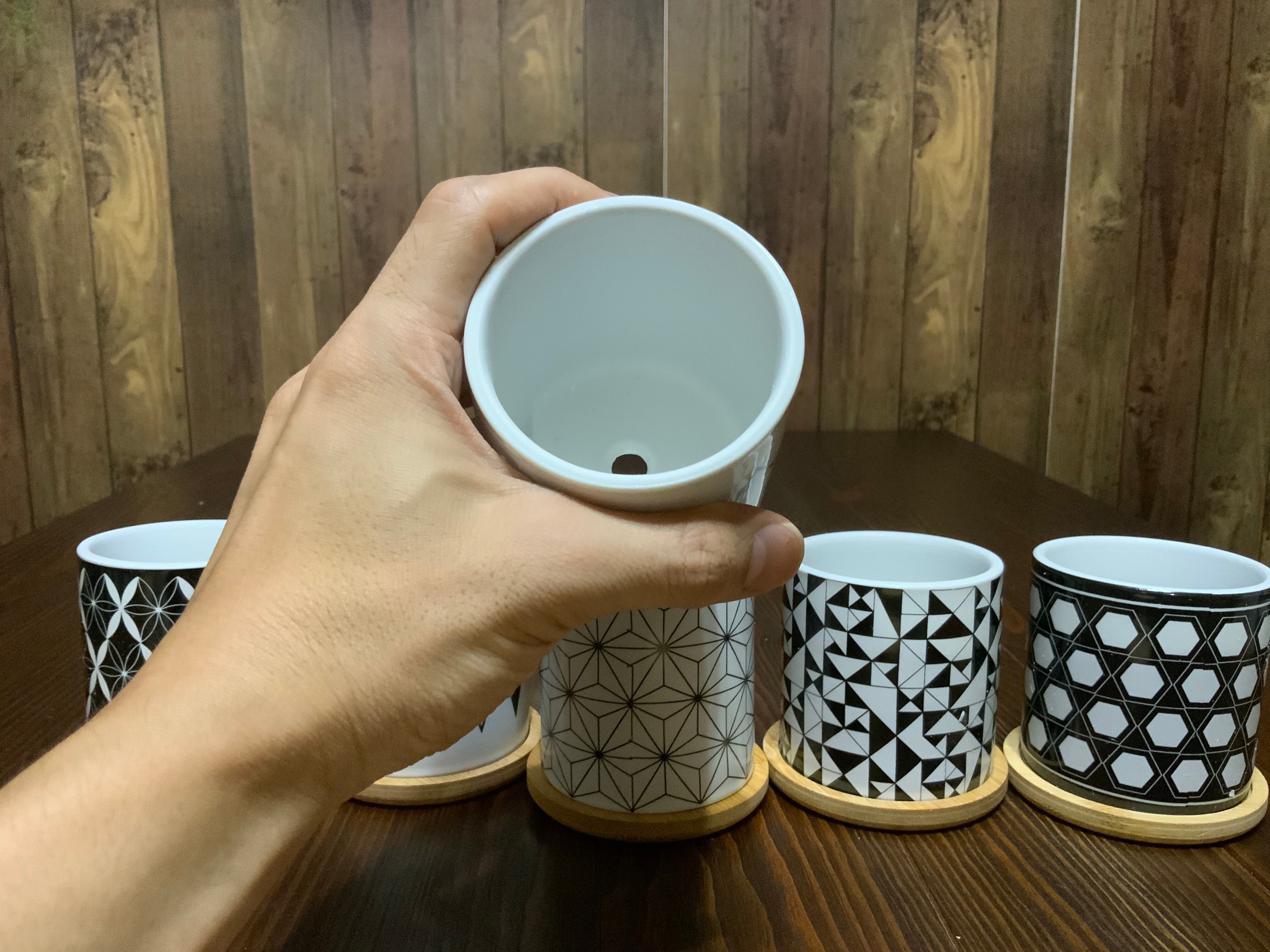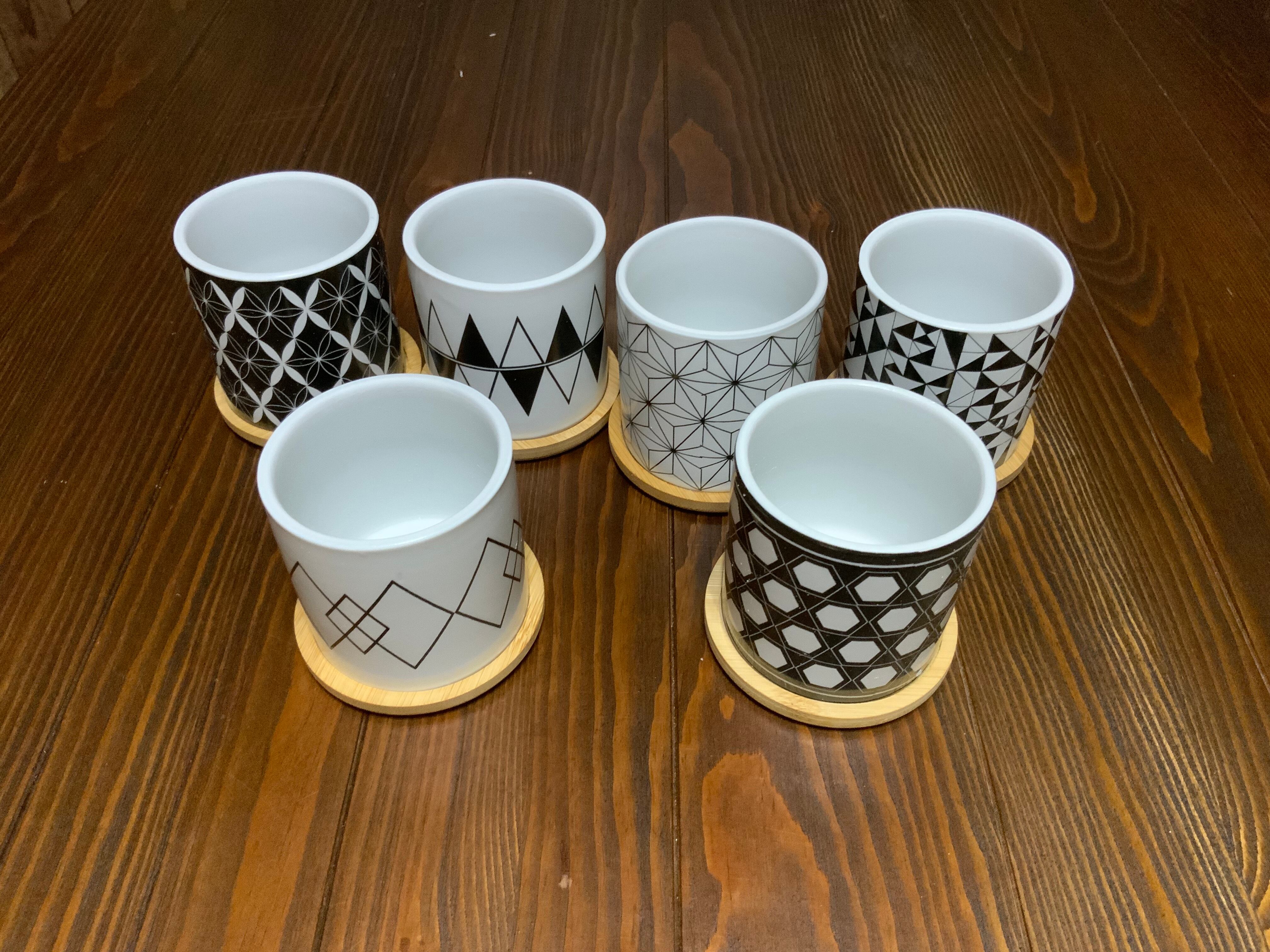 6鉢セットでおしゃれで統一感が出ますので観葉植物や多肉植物にオススメです。木製のコースターもセットです。